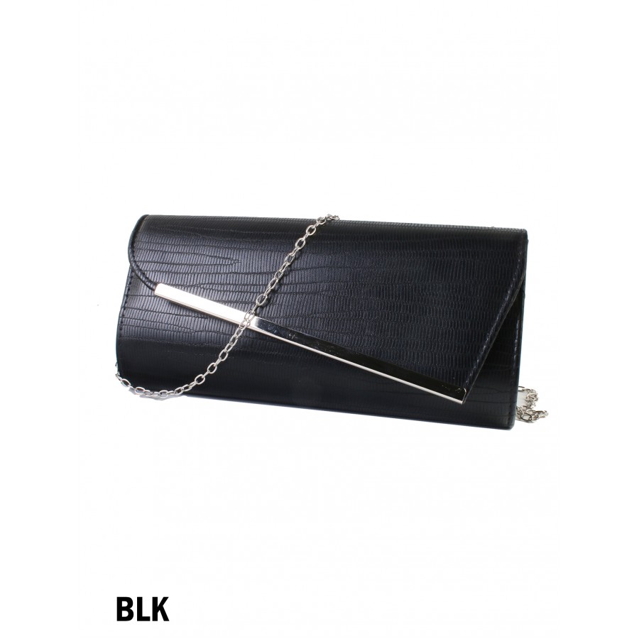 Faux leather evening clutch with front flip. Comes with long silver chain approx. 47".Colour: Black.