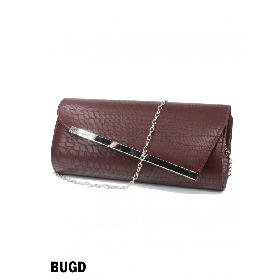 Faux leather evening clutch with front flip. Comes with long silver chain approx. 47".Colour: Burgundy